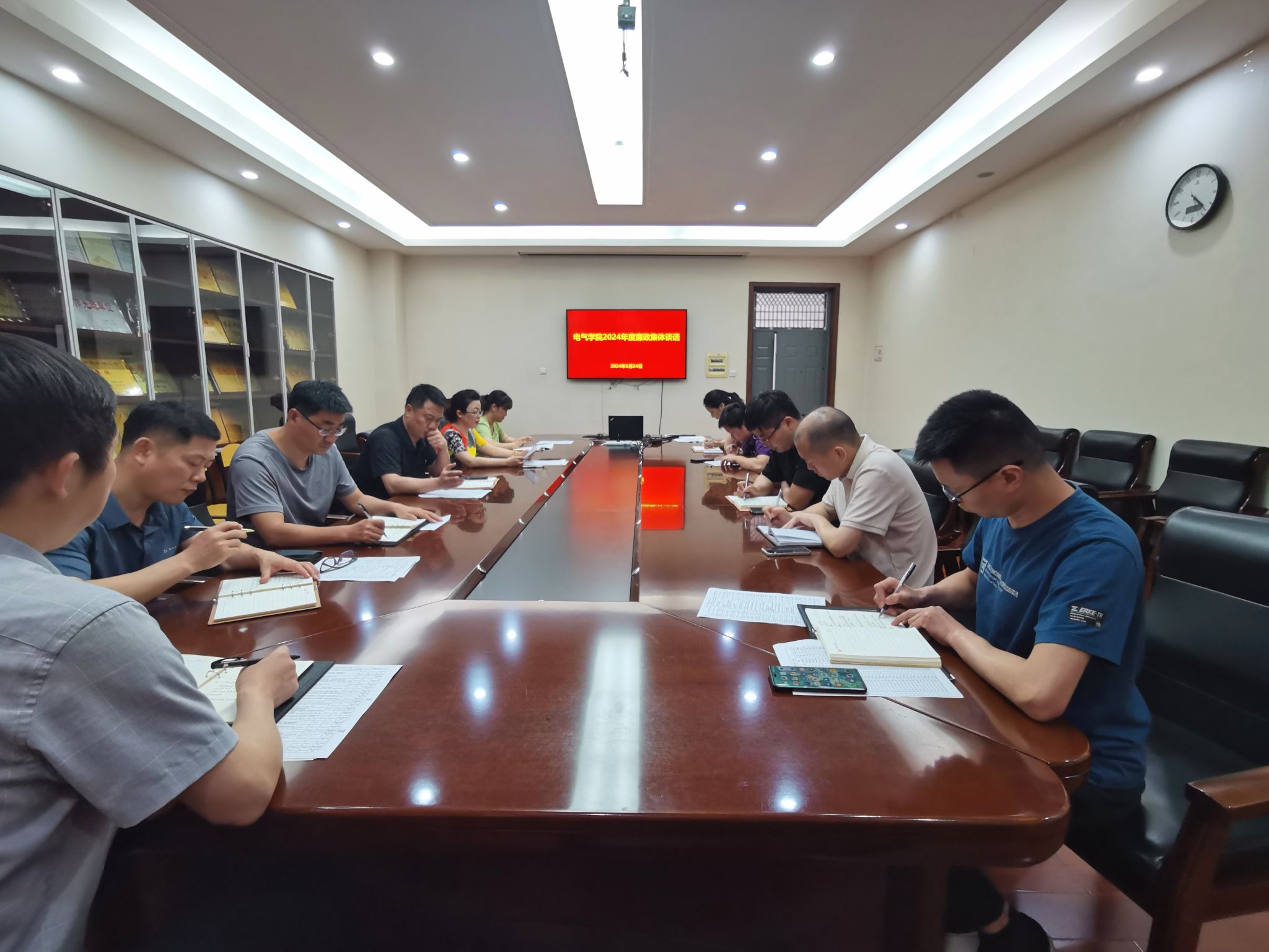 在215会议室开展2024年度廉政集体谈话,全体处科级干部参加会议。会议由学院党委书记李慧敏主持。