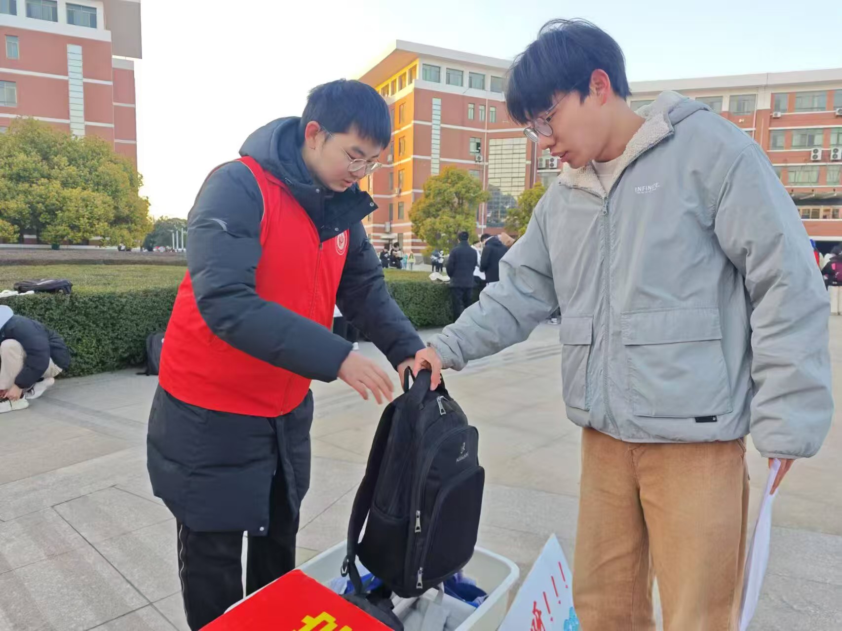 活动当天,身着统一服装的志愿者们成为了考场外一道亮丽的风景线。他们忙碌而有序地穿梭于各个角落,承担起管理考研学子私人物品的重任。从书包、水杯到复习资料,每一份物品都被细心地放置在指定位置,并附有详细的记录,确保学子们在需要时能够迅速找到。考试结束后,志愿者们更是协助考生核对身份,确保他们顺利取回自己的物品,这一细致入微的服务赢得了考生们的一致好评。