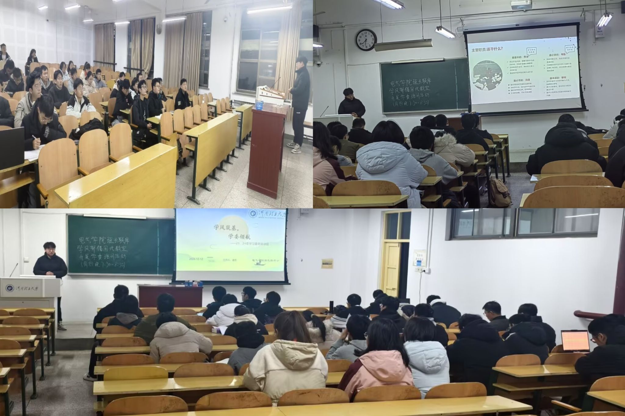 为进一步提升新晋学委自身能力,加强学院学风建设。伊莉影片区 班长联席会学风部于2024年12月12日在电气楼305教室举办“学风筑基,学委领航”主题活动——23、24级学习委员培训大会。