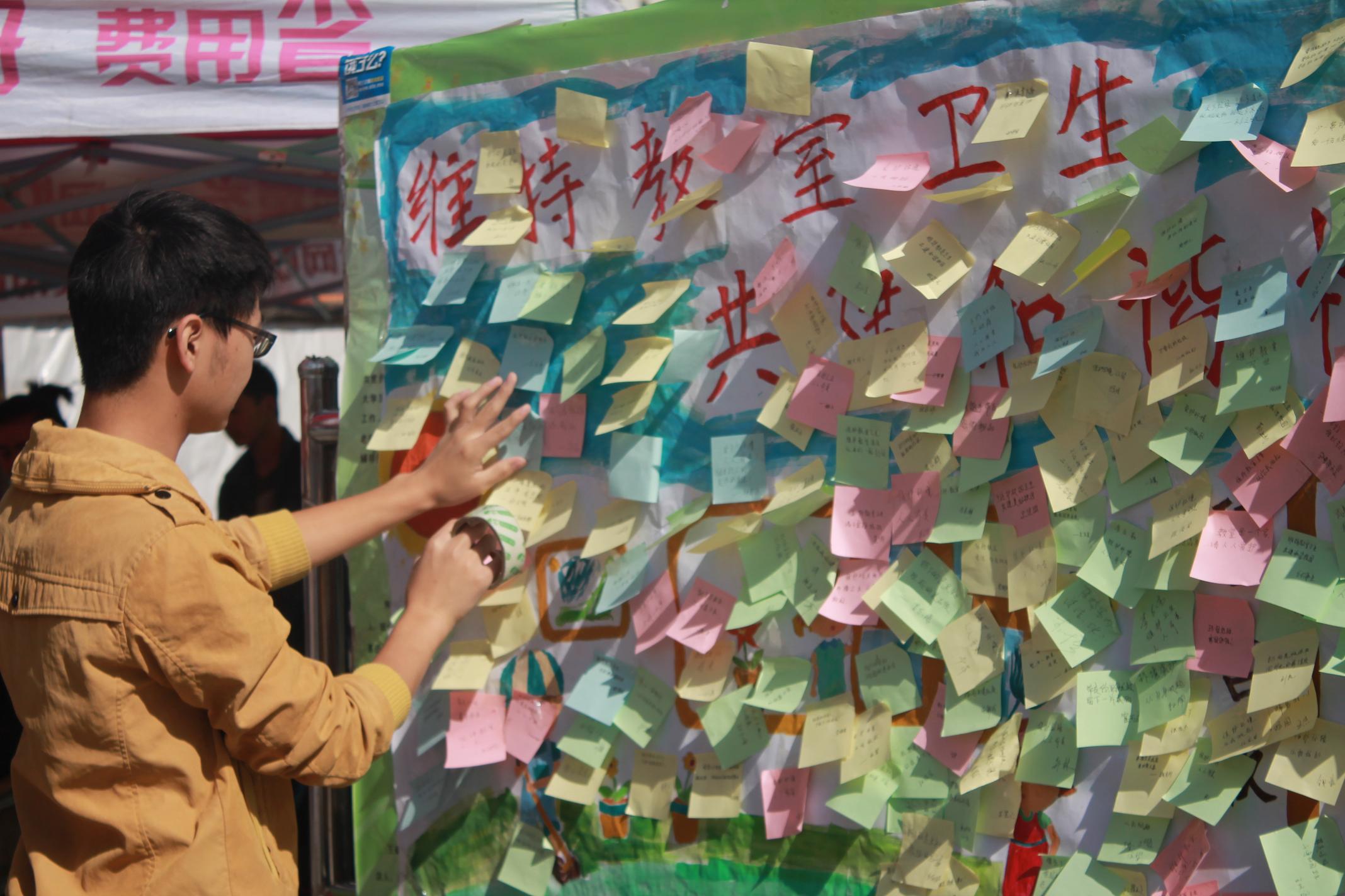 活动伊始,伊莉影片区 的志愿者们积极主动地向同学们宣传本次活动的主题,并耐心讲解教室维洁对维护校园与自身形象的重要性。活动开展不久便吸引了大多同学的关注并得到了肯定,不少同学表示此次宣传活动的主题反应了他们内心的真实想法,承诺会努力保持教室整洁,不留下废弃物,为营造洁净的教室献出自己的力量,并且在宣传板上贴上了带有自己口号的便利贴——“保持教室卫生是我们义不容辞的责任”、“一屋不扫,何以扫天下”等标语,还在宣传横幅上郑重签下了自己的名字。本次活动开展顺利,现场气氛热烈,得到了同学们的一致好评。最终同学们合影留念,并将条幅挂于公告栏与电气楼大厅,引导同学们积极保持教室卫生。