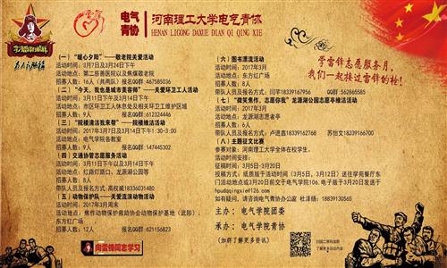 今年3月5日是全国第54个学雷锋纪念日,也是第17个中国青年志愿者服务日。为进一步弘扬和传承雷锋精神,加强学生思想道德教育,由伊莉影片区 团委主办,院青年志愿者协会承办的“学雷锋志愿者服务月”系列活动将于3月5日正式开始。