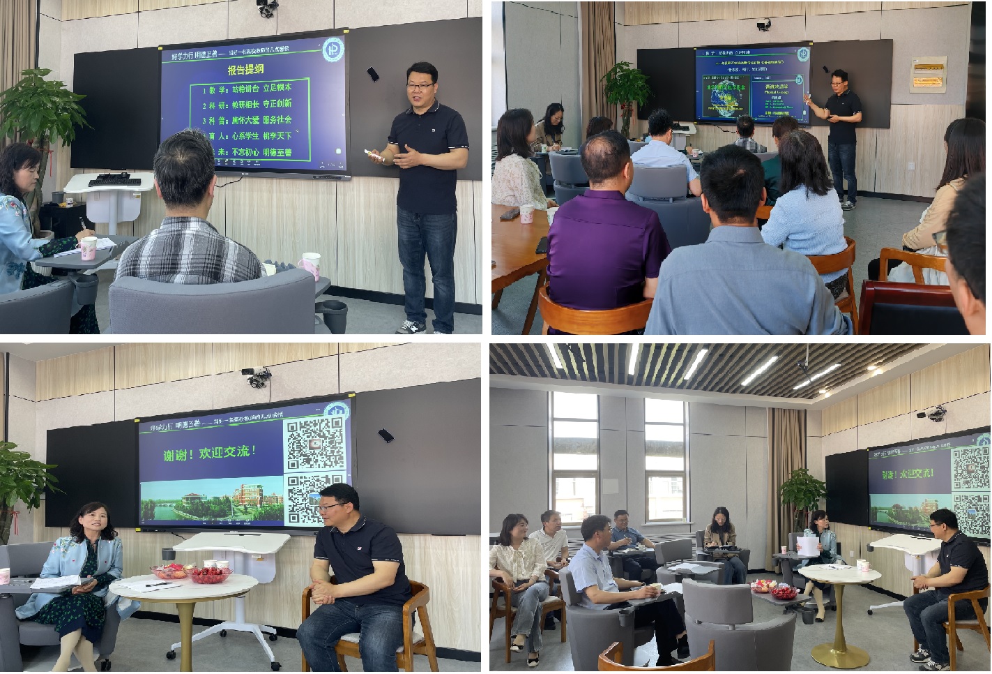 郑德顺教授分别从教学(站稳讲台 立足根本)、科研(教研相长 守正创新)、科普(胸怀大爱 服务社会)、育人(心系学生 桃李天天)、未来(不忘初心 明德至善)五个方面与在场教师进行分享。首先,郑教授强调“教学是教师的本职工作,要站稳讲台,要以学生的视角来组织教学”,他结合自己16年的从教经历和教学经验,为大家传授如何做一个 “底蕴丰厚”的好教师;其次,他从如何思考科研课题,如何从学科方向出发联系实际凝练科学问题等出发,同时结合自身主持的四个国家自然科学基金的撰写经验和申报历程,为老师传授“科研反哺教学、教学促进科研”的宝贵经验;接着,他从地质科普公益活动方面分享自己的科普经历,他指出“科学思维培养要从娃娃抓起”,他热心公益活动,胸怀大爱,淡泊名利勇于奉献的精神深深感染了在场的每一个人;最后,他从立德树人方面以丰富案例为教师们分享了他培养学生成人成才的心路历程,他指出“要用父母对孩子的爱一样来对待每一位学生,施教过程中对学生宽严并济、理解尊重、践行大爱精神”,他对学生无私的爱感动了现场的每个人。